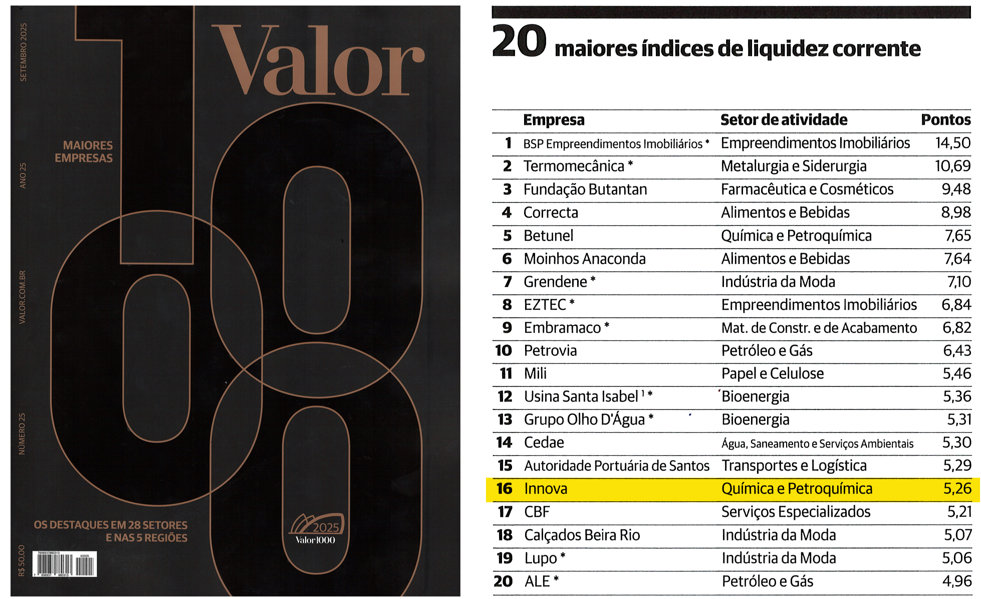 Ranking Valor 1000: Innova entre as 20 Empresas com Maiores Índices de Liquidez Corrente do Brasil. 18 de setembro de 2025