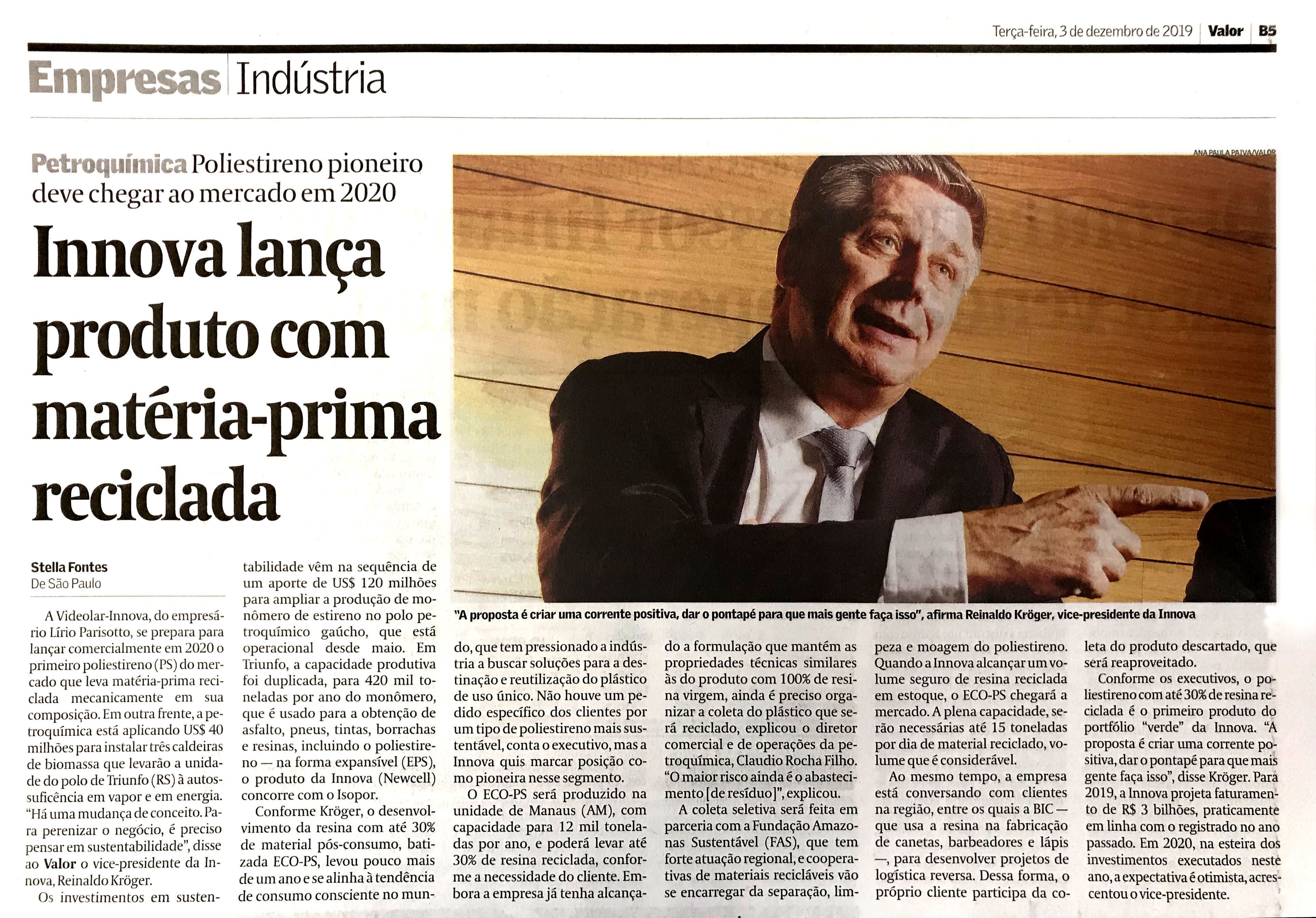Valor Econômico: Innova lança poliestireno pioneiro: ECO-PS, com material pós-consumo reciclado em sua composição. 3 de dezembro de 2019